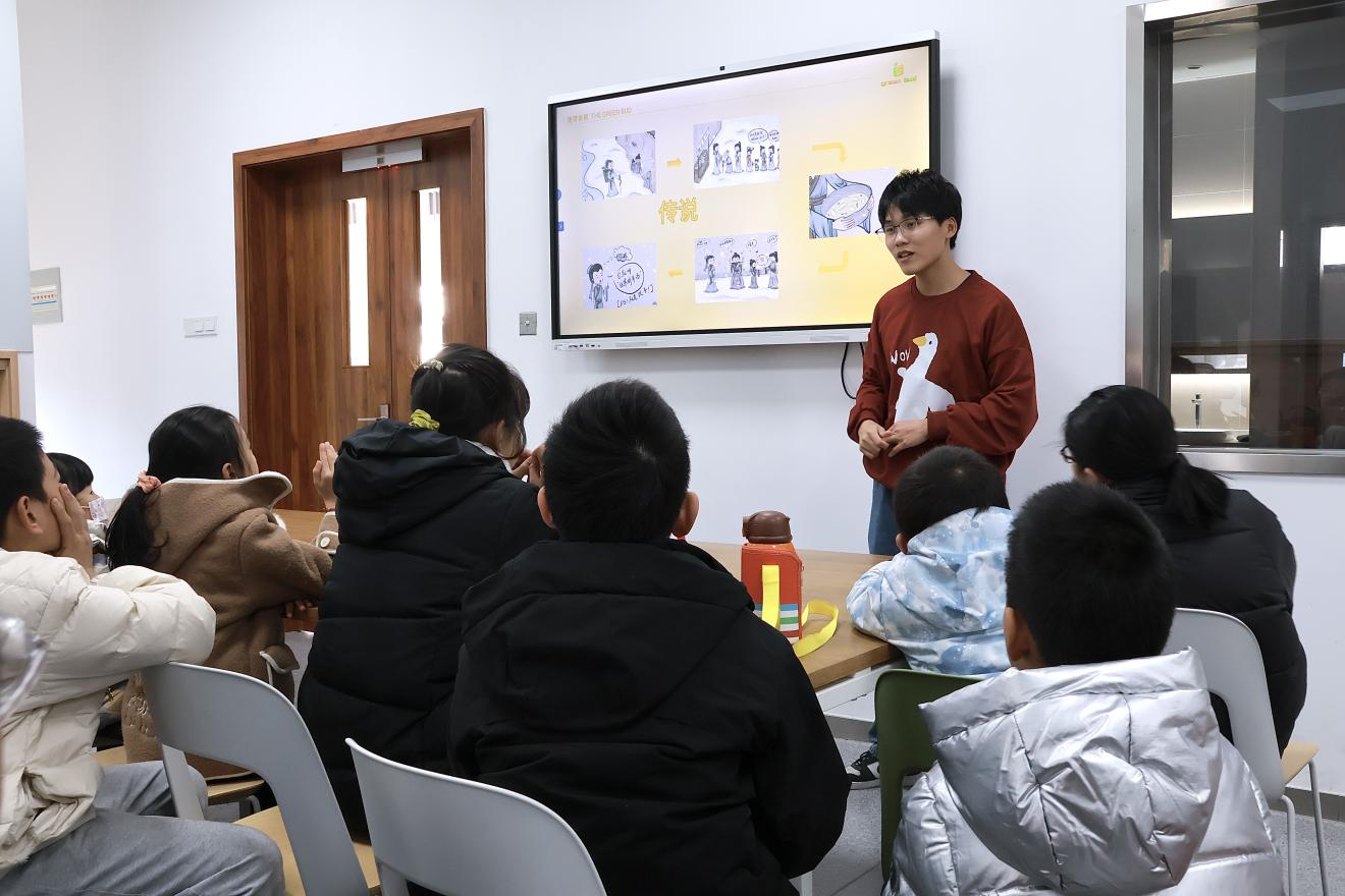 活动以猜谜的形式拉开序幕。来自青芽食育的大学生科普教员通过提问引导孩子们思考饺子的起源和文化寓意,激发了他们对传统美食的浓厚兴趣。随后讲解的是饺子的历史渊源,从东汉时期的“娇耳”到如今的饺子,孩子们听得津津有味,对饺子的文化背景有了更加深入的了解。课上还介绍了饺子的营养元素,通过趣味连线的方式让孩子们学会辨识饺子的食品配料表和营养标签等实用知识。