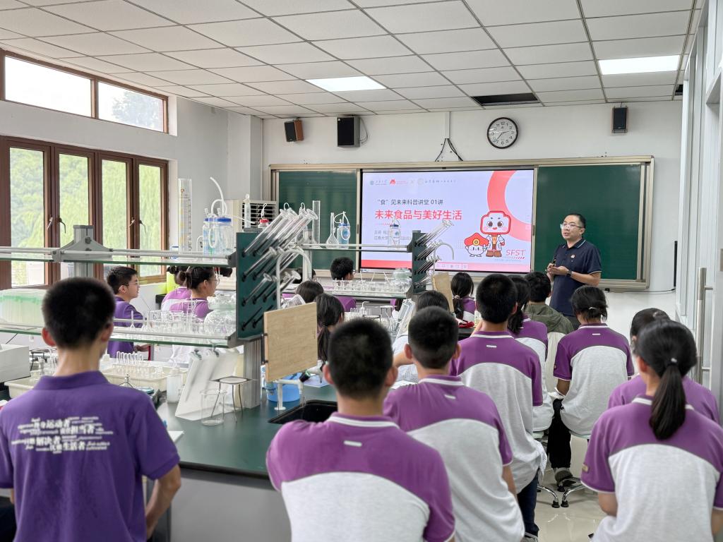 科普课堂上,澳门电子pg游戏官网副院长程力围绕“什么是食品产业”“什么是未来食品”“未来食品如何影响美好生活”三个方面展开课程。他介绍我国食品产业的发展历程,阐述食品产业的重要地位,普及食品感知、精准营养、智能制造、智慧监管等前沿未来食品科技,以细胞培养肉、植物基食品、食品感知技术为例诠释未来食品如何影响美好生活,并向同学们展示了澳门电子官网人工智能技术与食品科学深度融合的智能化应用成果——食品学科大模型“FoodSeek”。这些前沿科技与课堂内容,均源自澳门电子pg游戏官网的核心教学与科研方向。作为我国食品学科领域的顶尖学府,学院开设食品科学与工程、食品质量与安全、食品营养与健康等专业,拥有国家级实验教学示范中心、国家功能食品工程技术研究中心等一流平台,与省锡中此次联合打造的科普课程,正是学院“将前沿科研转化为育人资源”的缩影。