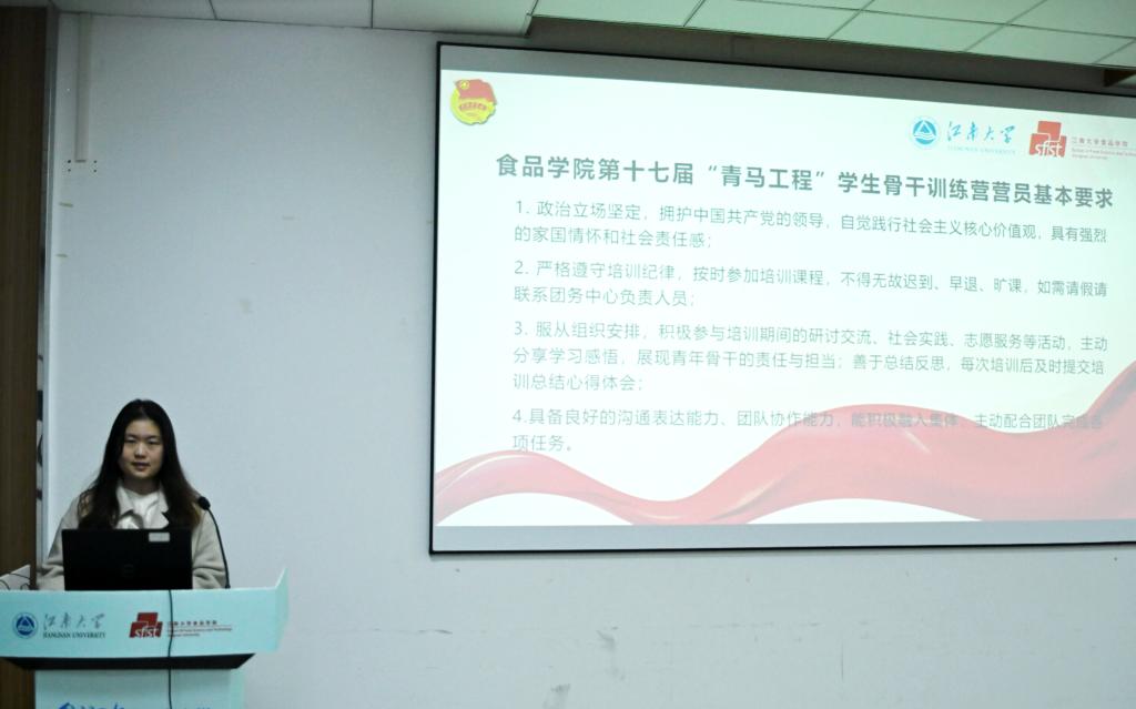 新营员代表、食质2401班夏佳怡发言。她分享自己对青年马克思主义者培养工程的认知和理解,表达了对接下来培训的期待,并代表全体营员庄严承诺,将以饱满的热情、积极的态度投入到培训全过程中,认真完成每一项工作任务,不断锤炼自我、开阔视野、增长才干。