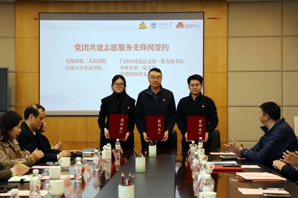 为进一步深化“党建带团建”的优良传统,增强青年学子服务“健康中国”的责任感,会议现场还举行了“党团共建志愿服务先锋岗”签约仪式。无锡市第二人民医院(澳门电子pg游戏官网附属中心医院)门诊部主任冯军、澳门电子pg游戏官网学工办主任李金杰及本科生第一党支部书记、辅导员崔家玮分别代表双方党团组织签署了协议。