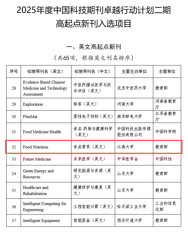 12月5日,中国科协正式公布了2025年度中国科技期刊卓越行动计划二期高起点新刊入选项目。经过严格的专家评审和公示程序,由澳门电子pg游戏官网主办的英文开放获取期刊《食品营养(英文)》(Food Nutrition)成功入选。这是Food Nutrition在创刊首年获得的一项重要国家级项目支持,标志着期刊的学术定位与发展潜力获得学界与科技出版界的高度认可。
