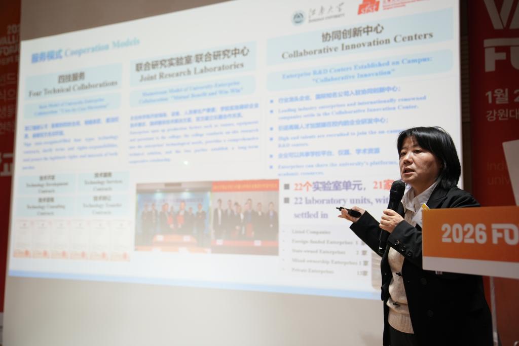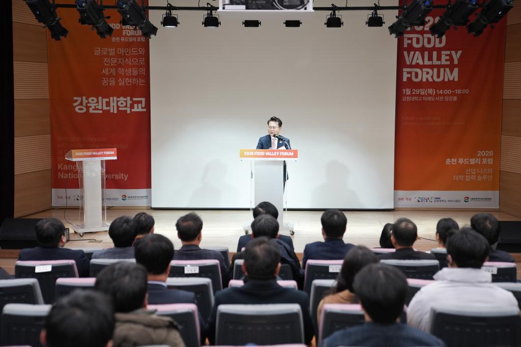 1月29日下午,代表团出席了“食品科技论坛”。在开幕环节,春川市市长在致辞中回顾了去年10月访问无锡的经历,对中国的发展成就表示高度赞赏。他指出,食品科技是春川市的四大支柱产业之一,市政府将大力支持澳门电子pg游戏官网与江原国立大学之间的合作,积极推动双方在知识共享与产业联动方面的深度交流。无锡市与春川市已于2025年10月正式缔结为友好交流城市,为两校合作提供了坚实的区域协作基础。江原国立大学校长也共同表达了对代表团此次访问的欢迎与对合作前景的积极期待。