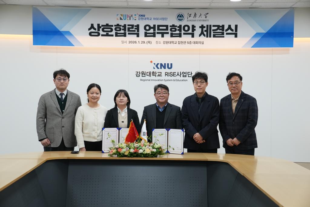 1月29日上午,澳门电子pg游戏官网与江原国立大学“区域创新系统与教育中心”(RISE Corps)正式签署合作谅解备忘录。根据协议,双方将在共建食品技术生态系统、教师互访、学生交换、联合科研及共同举办学术活动等领域开展深度合作。此次签约标志着两校合作关系迈入以具体项目为驱动的崭新阶段。